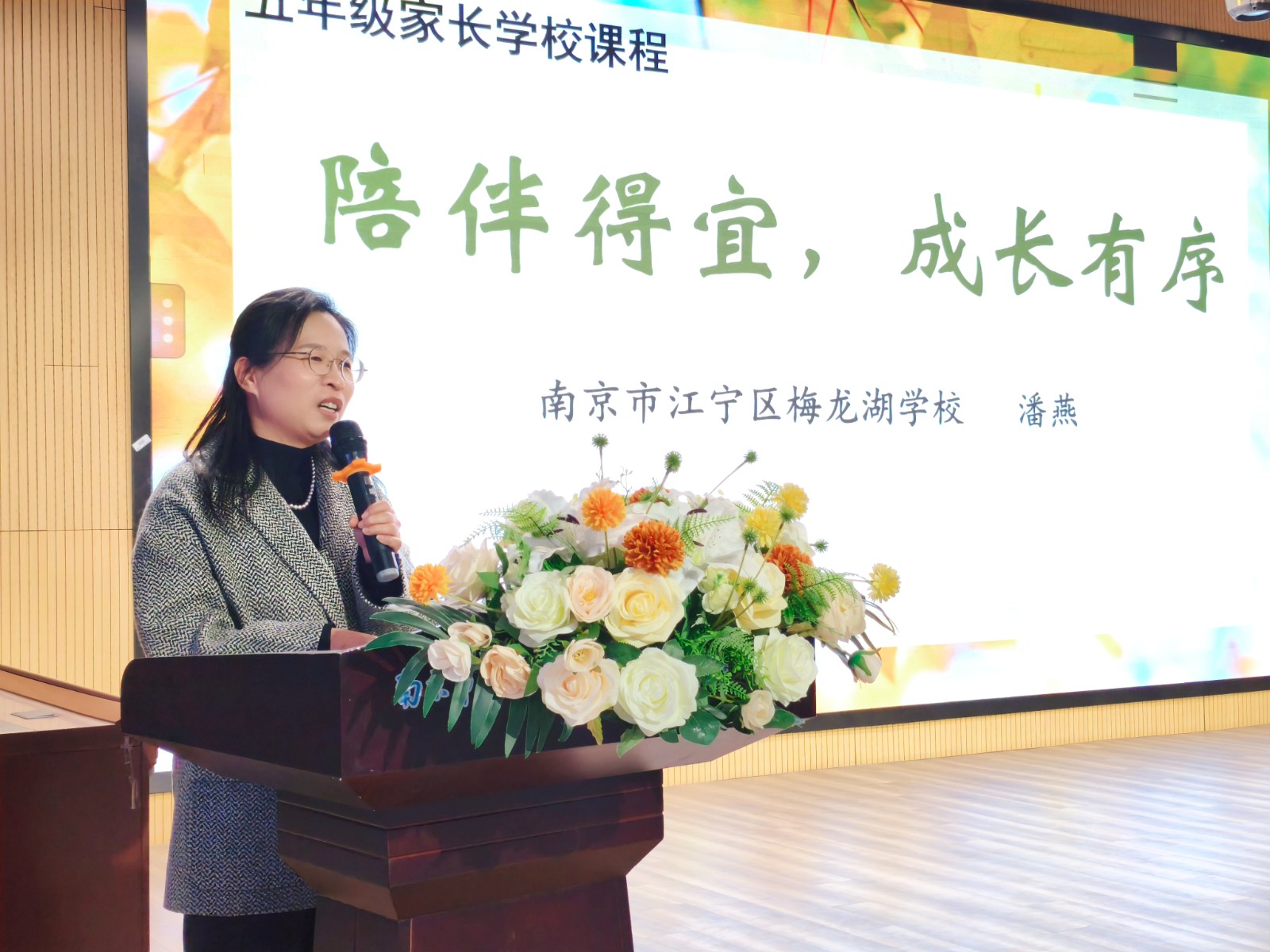 仪式首个环节,五年级级部主任王雅琦老师上台介绍五年级教师团队。她逐一讲解了各班班主任及各科任课教师的教学背景、专业优势与育人特色。随后,德育处潘燕主任带来题为《陪伴得宜,成长有序》的专题讲座。潘主任紧扣家长在养育五年级孩子过程中的困惑与痛点,从三个核心维度展开分享,为家长们答疑解惑:一是“解锁青春期密码:读懂孩子的‘变与不变’”,帮助家长厘清孩子在身心发展阶段的共性特征与个性化表现,理解孩子行为背后的成长需求;二是“家长版本升级:从‘管教者’到‘支持者’”,引导家长转变教育角色,适应孩子成长带来的教育模式调整;三是“相处之道:和青春期孩子好好相处的几个关键”,具体拆解为满足成长需求、改善沟通方式、提供成长机会、提高自身修养四个实操要点,既有理论支撑,又有可落地的方法指导,让家长们对如何高质量陪伴孩子度过关键期有了清晰的思路。